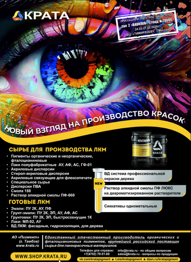 Компания является постоянным участником отраслевого смотра, каждый раз представляя широкий спектр продукции для лакокрасочной отрасли: пигменты, дисперсии и эмульсии, полуфабрикатные лаки и смолы, лакокрасочные материалы промышленного и строительного назначения, а также специальные добавки и химическое сырье. С традиционным ассортиментом и новинками торговой марки КРАТА® можно будет ознакомиться в течение четырех выставочных дней на стенде компании №2D080, зал 2 «ВАВИЛОВ».